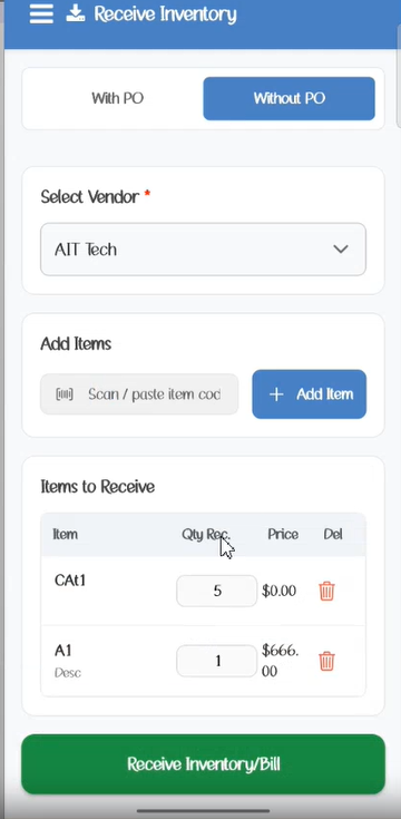 Receive Inventory with or without Purchase orders. Use scanning to quickly and Accurately receive.